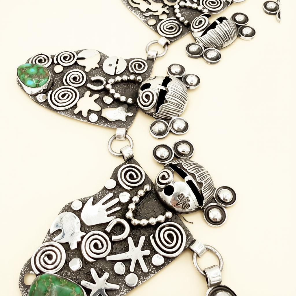 Handcrafted by Alex Sanchez, this necklace is made in sterling silver and measures 36 inches in length, featuring Sonoran Gold Maidens and Waterweb Grandmothers.
