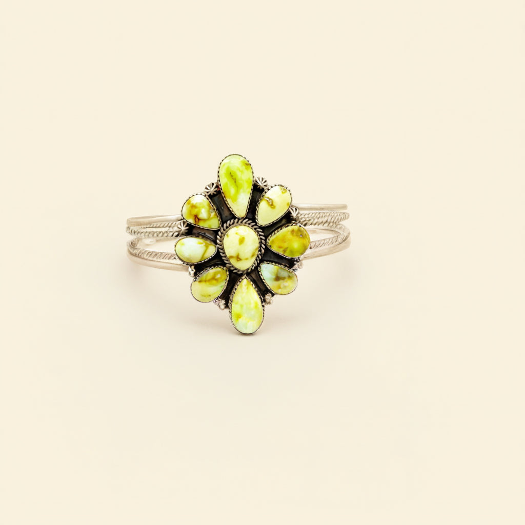 By HJC, this sterling silver Daydreamer cluster cuffs are fully adjustable and sized at approximately 7. Each cuff features their own distinct stone or stone combination, including Emerald Valley, Palomino, Golden Hills, Mine 8, and Sonoran turquoise.