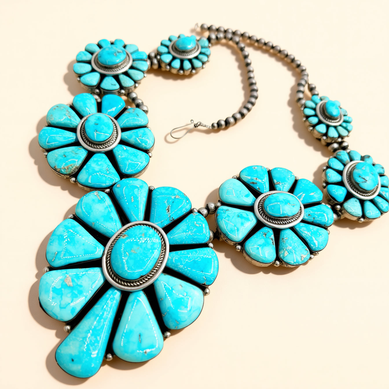 By Harley Jake, this sterling silver master set features vivid Blue Ridge Turquoise in a bold floral cluster design. Necklace measures 32 inches, cuff measures 6.5 inches with generous flex, designed as a true statement suite.