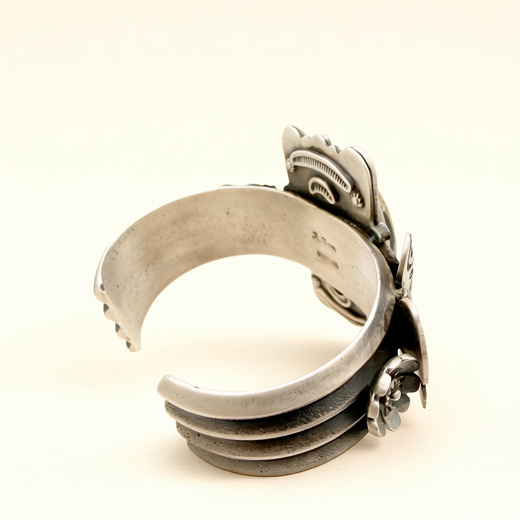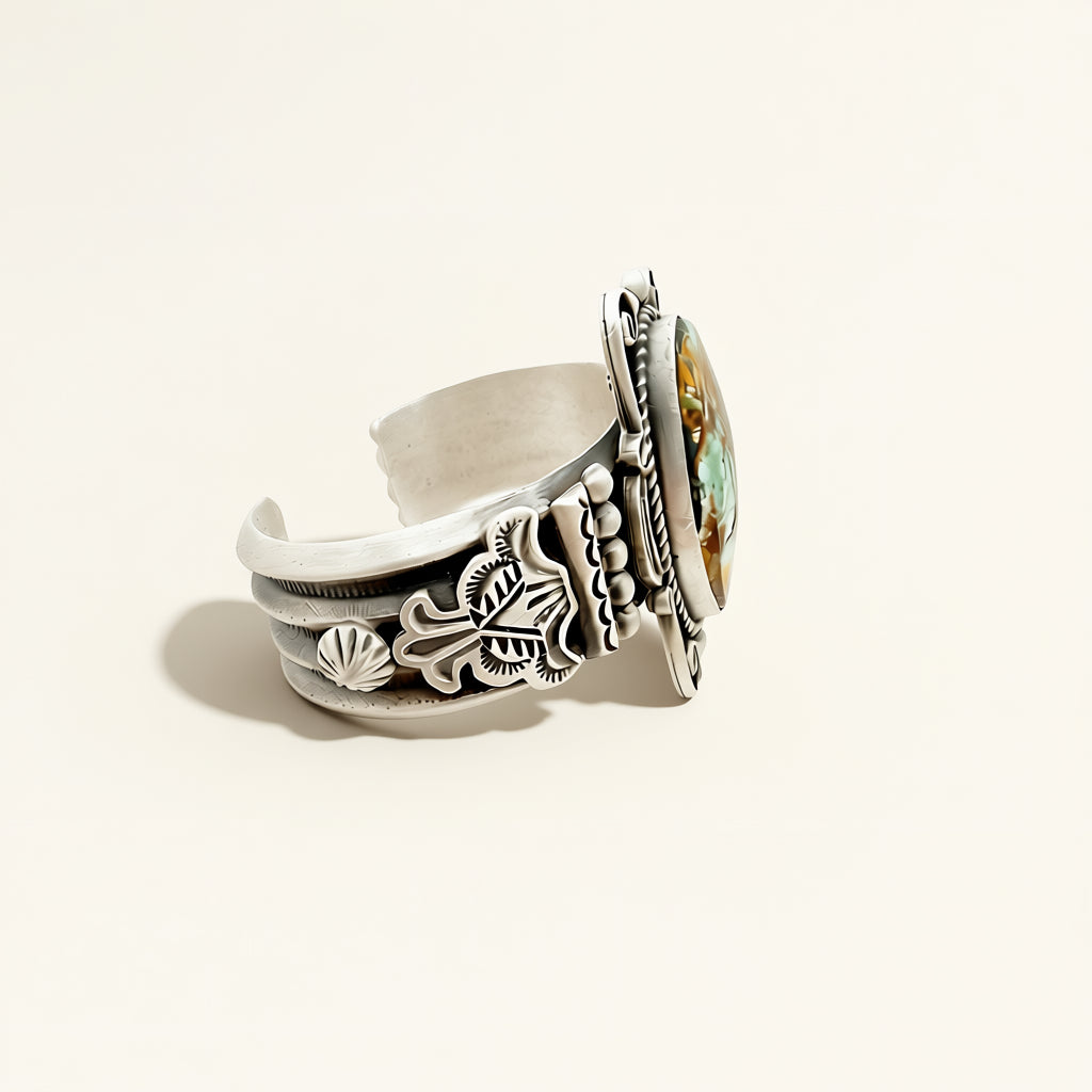 Handcrafted by Ronald Tom, this cuff is made in sterling silver and features Royston turquoise, measuring 6.5 inches with a 1.25 inch gap and no flex.