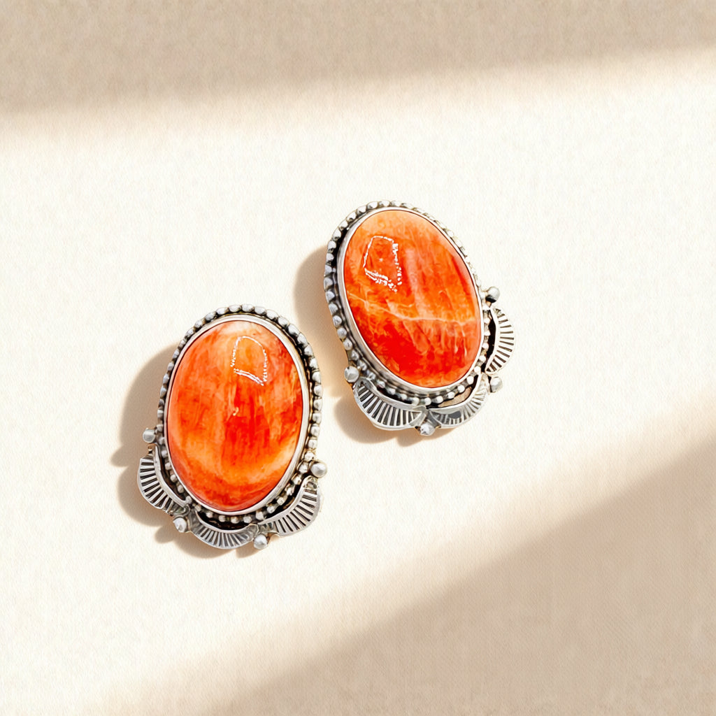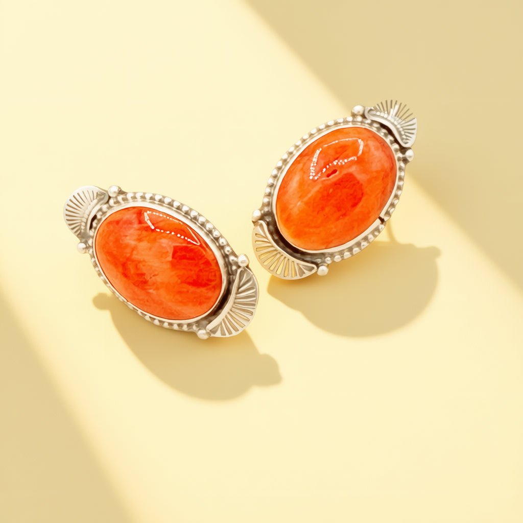 Handcrafted by Justine Tso (Baca), these statement studs feature Red Spiny oyster set in sterling silver, with a bold 1.5-inch profile and classic post-back construction. The scale and stone selection are intentional, designed to let the color do the talking.