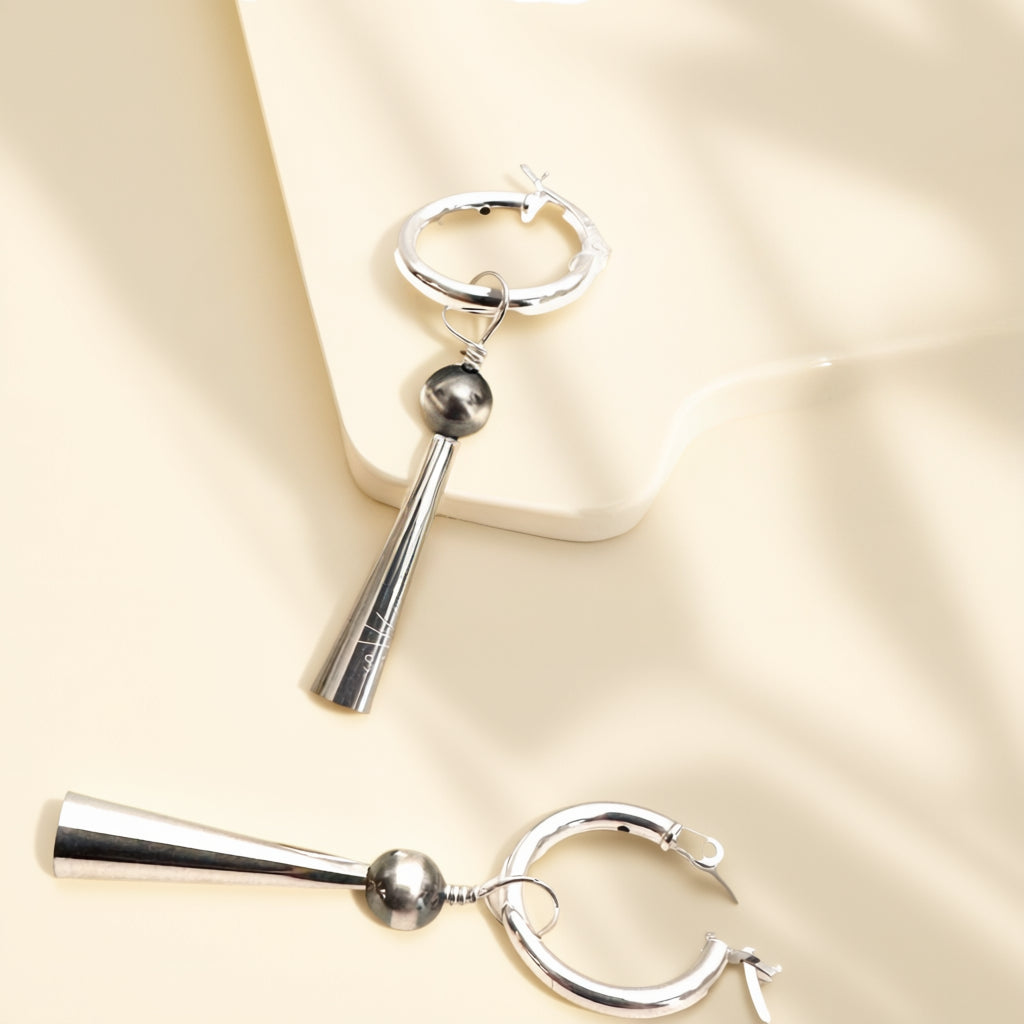 Inspired by the iconic earrings as seen in the new Martin Scorcese film "Killers of the Flower Moon" - these gorgeous dangle earrings have a removable charm with a silver cone and Sterling Pearl! Can also just wear as sterling huggers.