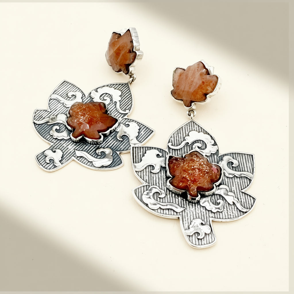Designed by HJC, these sterling silver statement earrings feature Sunstone and measure approximately 2.5 inches in length.