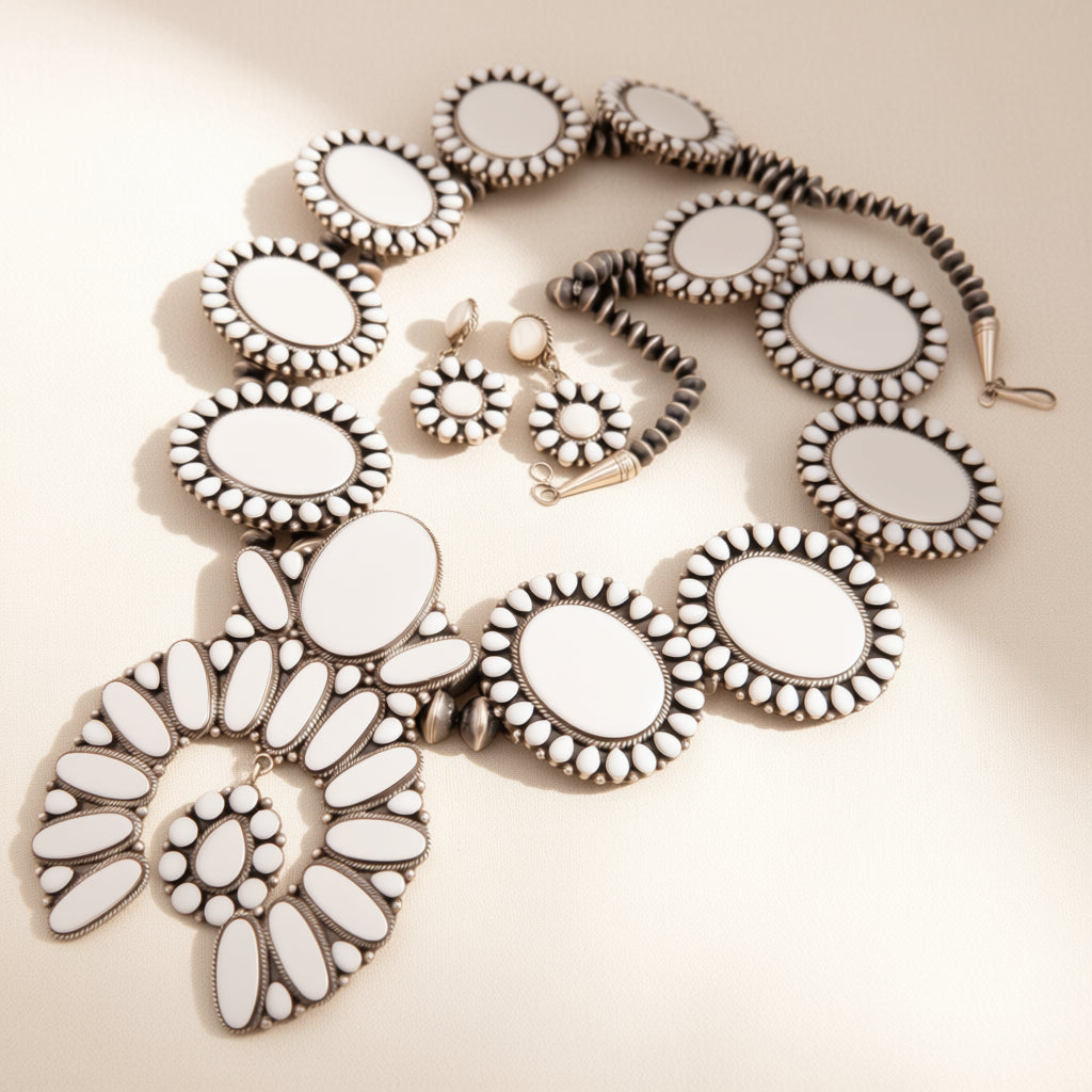 Introducing Tyler Brown’s First Ever Squash Blossom — an extraordinary Mother of Pearl masterpiece that radiates elegance and craftsmanship. This sterling silver squash blossom necklace, complete with matching earrings, features glowing Mother of Pearl cabochons arranged in a classic cluster silhouette that is both timeless and boldly modern.
