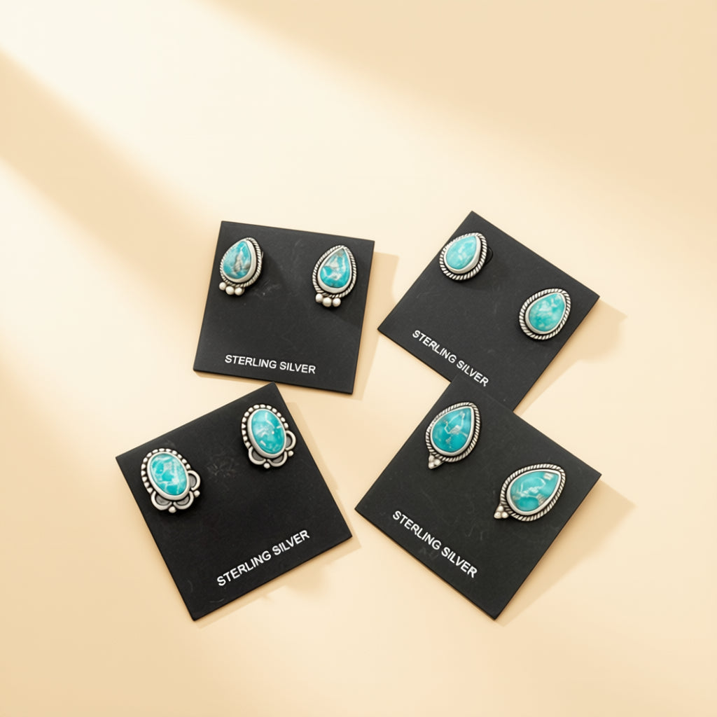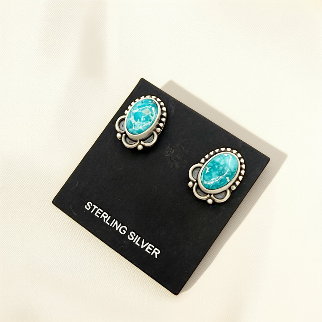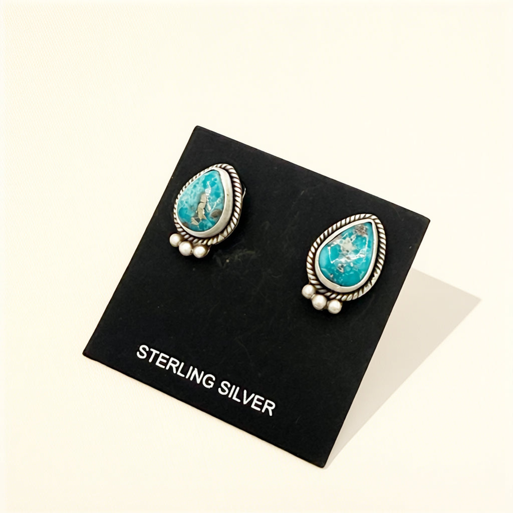 Designed in sterling silver, these stud earrings highlight White Water turquoise, prized for its bright blue tone and natural matrix. Finished with post backs for secure wear, the scale is clean and wearable without feeling minimal.