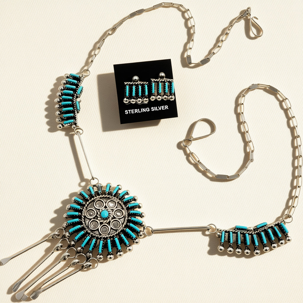 This Zuni Needlepoint Set is handcrafted in sterling silver and measures 20 inches.