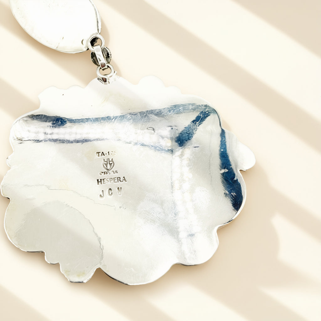 Created in collaboration with HJC, this sterling silver lariat by Jesus Vega features Mine 8 turquoise arranged in a bold cluster formation. The necklace measures 21 inches with an additional 6-inch drop.