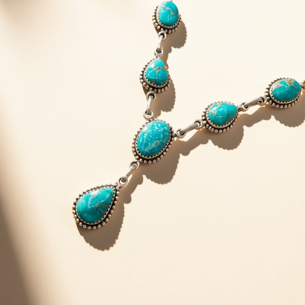 This sterling silver  lariat features Blue Ridge turquoise set along a 20-inch chain with a fluid drop silhouette.