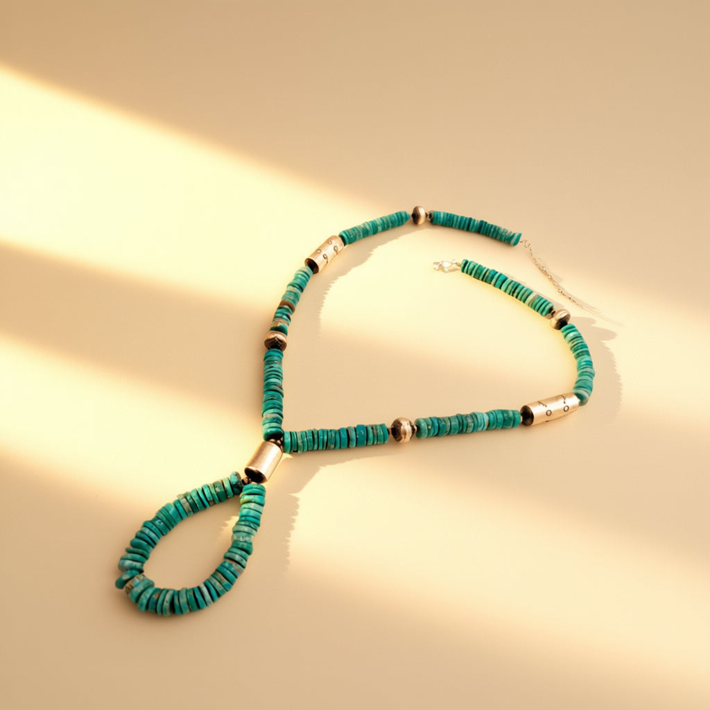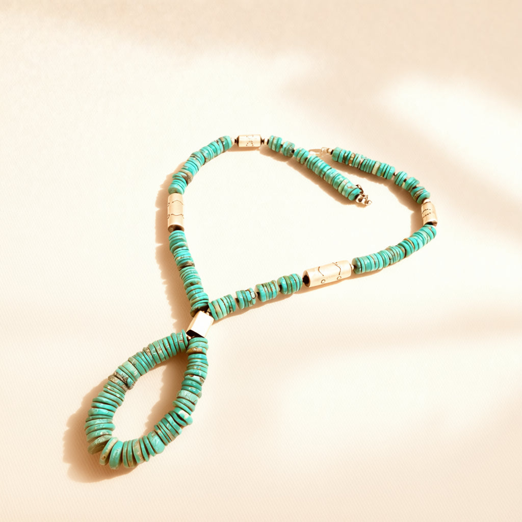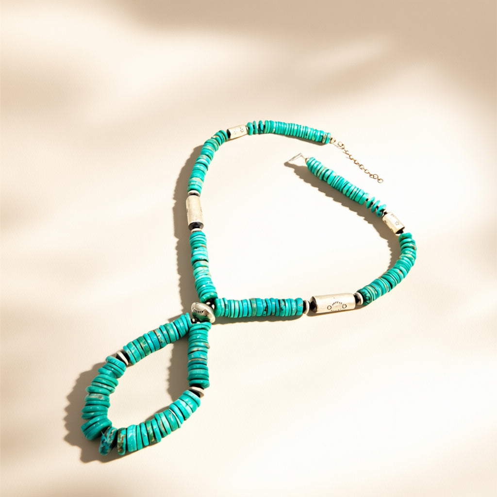 Designed by HJC, these sterling silver joclas feature Kingman Turquoise and measure 22 inches in length.