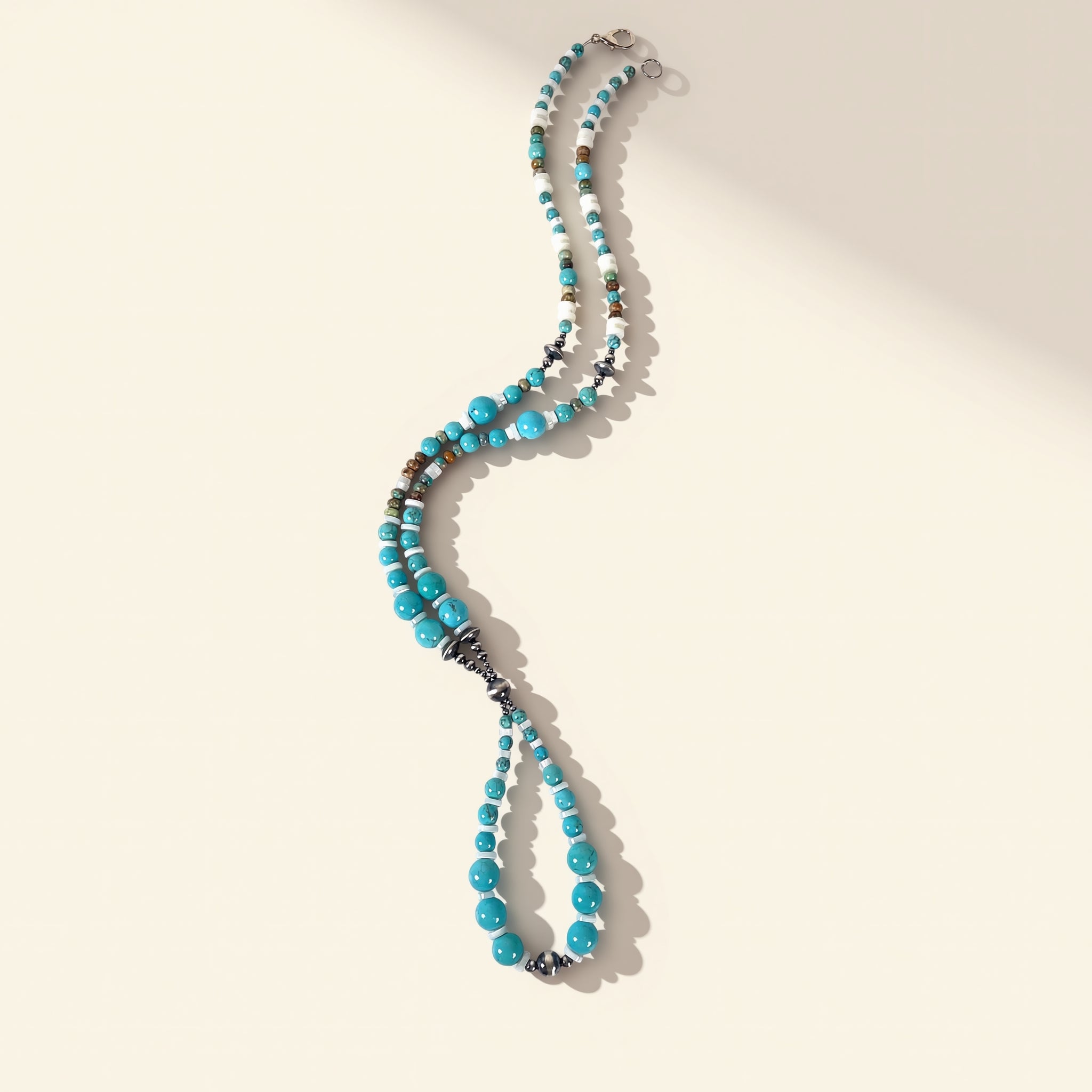 Mother of pearl brings a shifting, iridescent quality, where light moves across each surface in subtle layers rather than fixed color. Paired with the saturated blues of turquoise, the piece feels like a study in contrast between luminosity and depth.