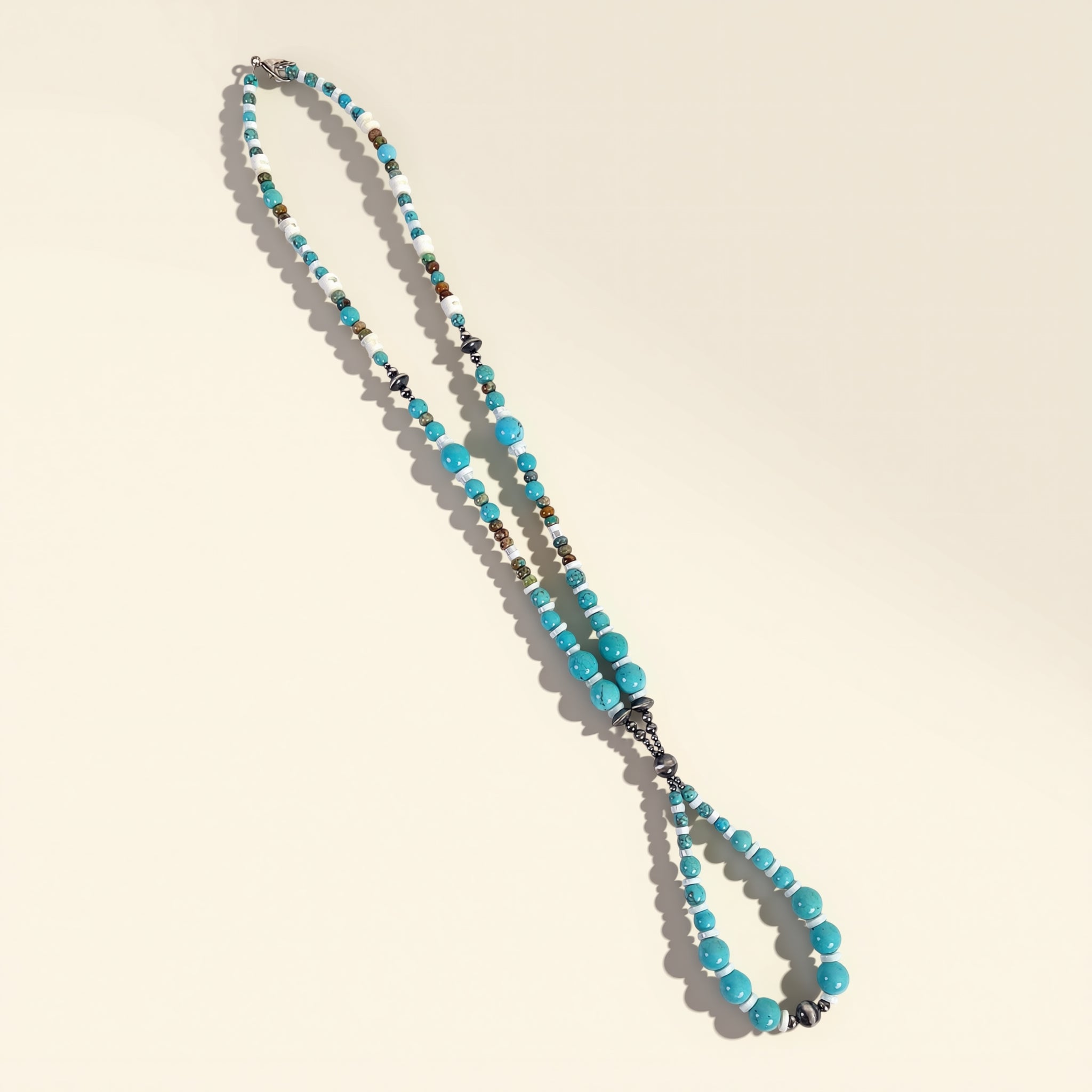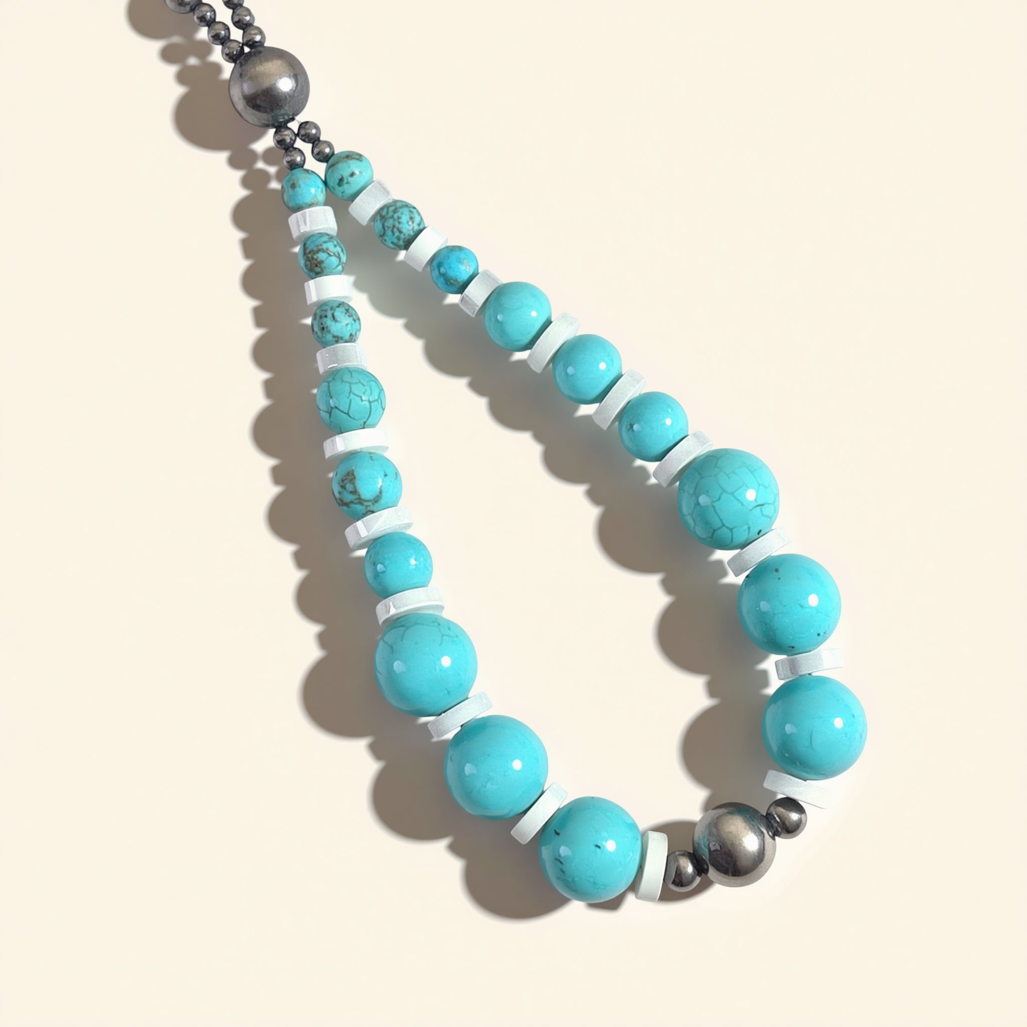 An artisanal beaded jocla necklace featuring Kingman Turquoise, Mother of Pearl, and Royston Turquoise, measuring approximately 28.5 inches with a 4.5 inch drop.
