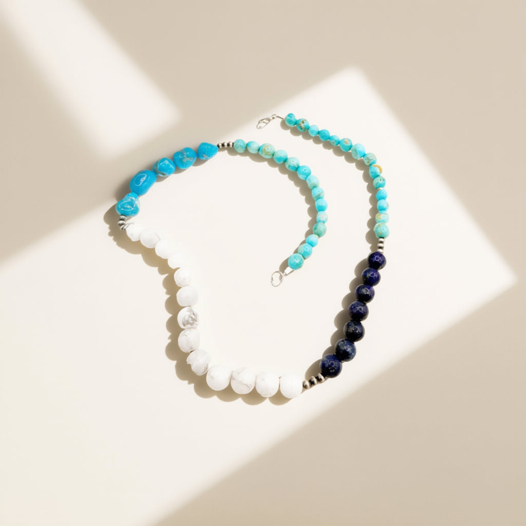 This multistone Navajo pearl necklace is crafted in sterling silver with HJC stones of Kingman Turquoise, Blue Grotto Turquoise, Lapis, and Howlite, arranged in a balanced sequence of color and texture. Measures 17 inches.
