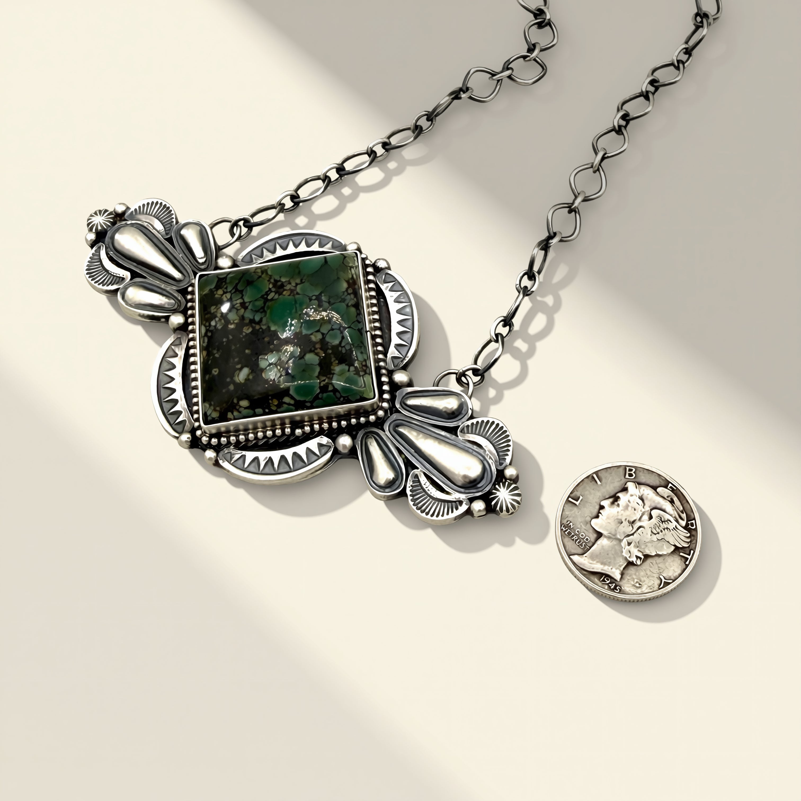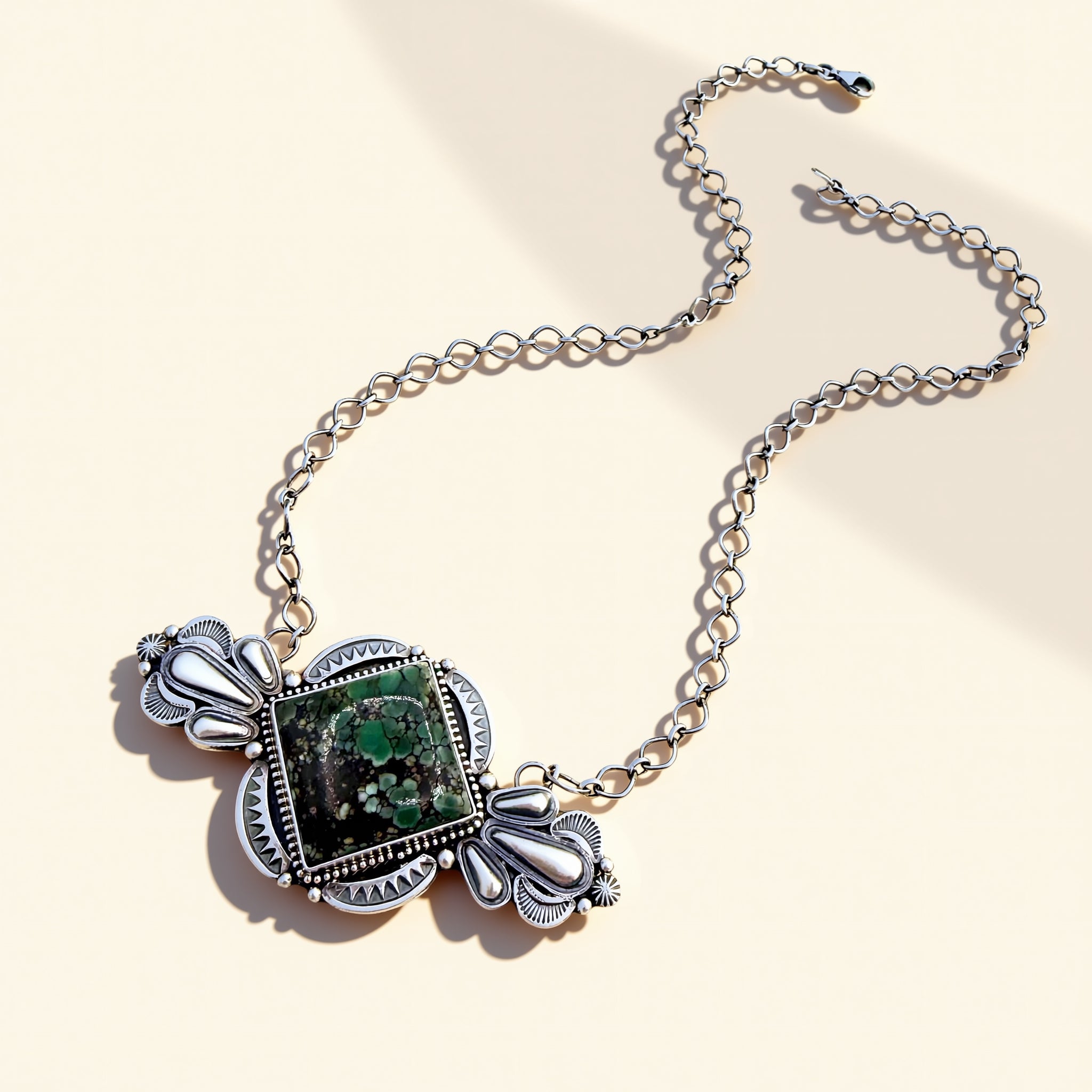 By Sheila Tso, this artisanal sterling silver necklace features Starfox Variscite and measures 20 inches.