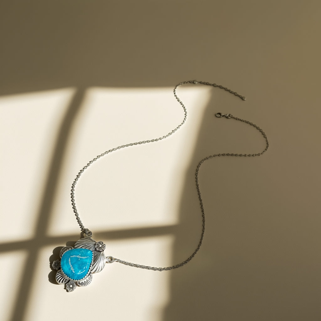 Designed in by HJC, this sterling silver necklace features Sierra Bella Turquoise and is a one of a kind piece!