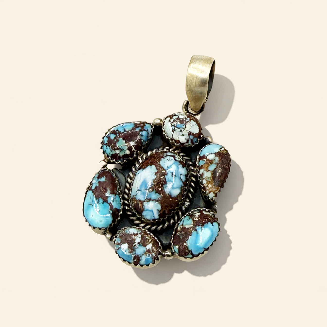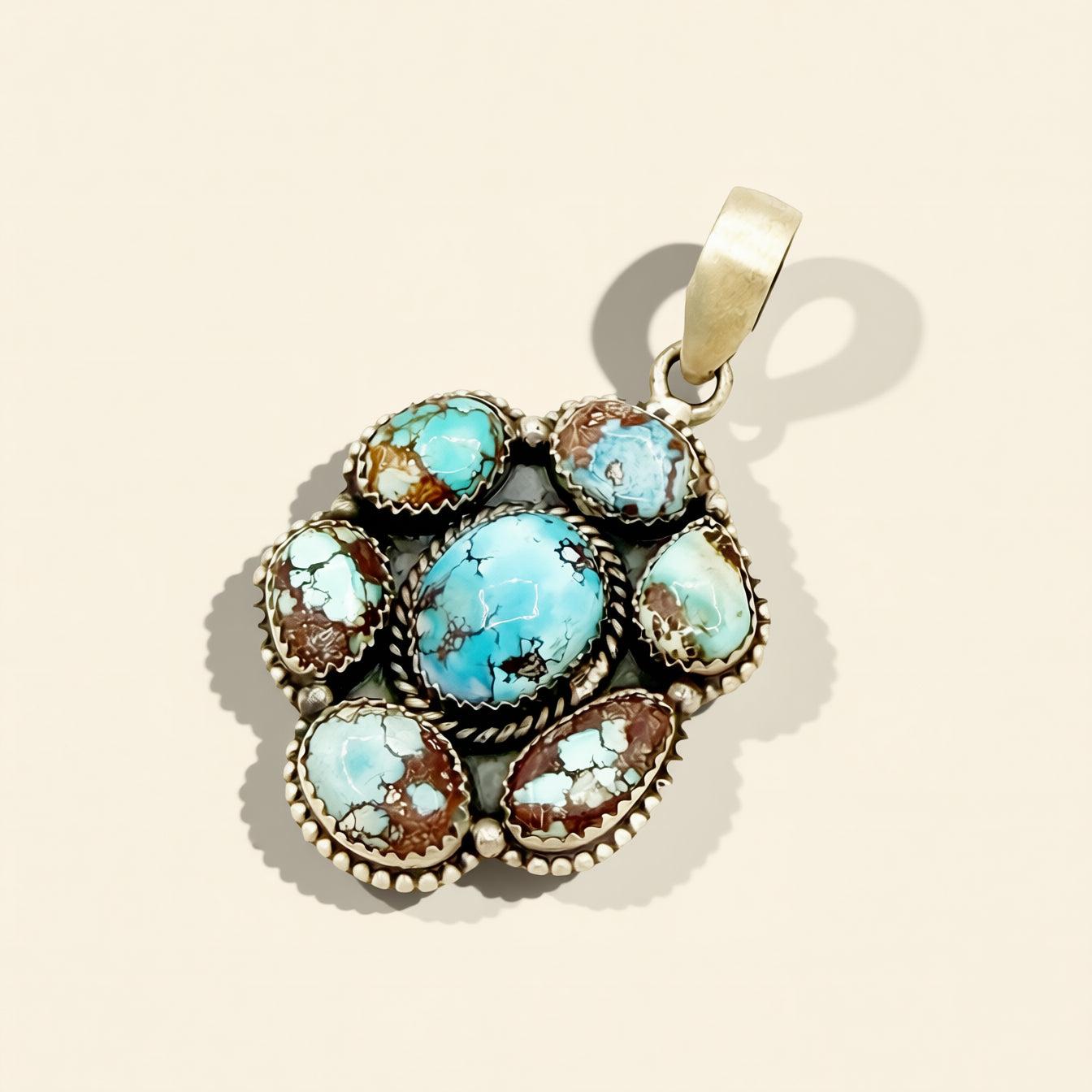 Designed by HJC, this sterling silver pendant features a vibrant cluster of Golden Hills Turquoise in a dimensional floral-inspired setting. It is handmade and measures 1.5 inches.