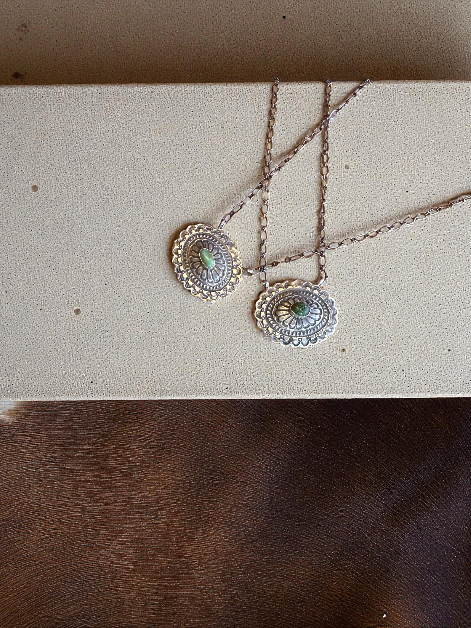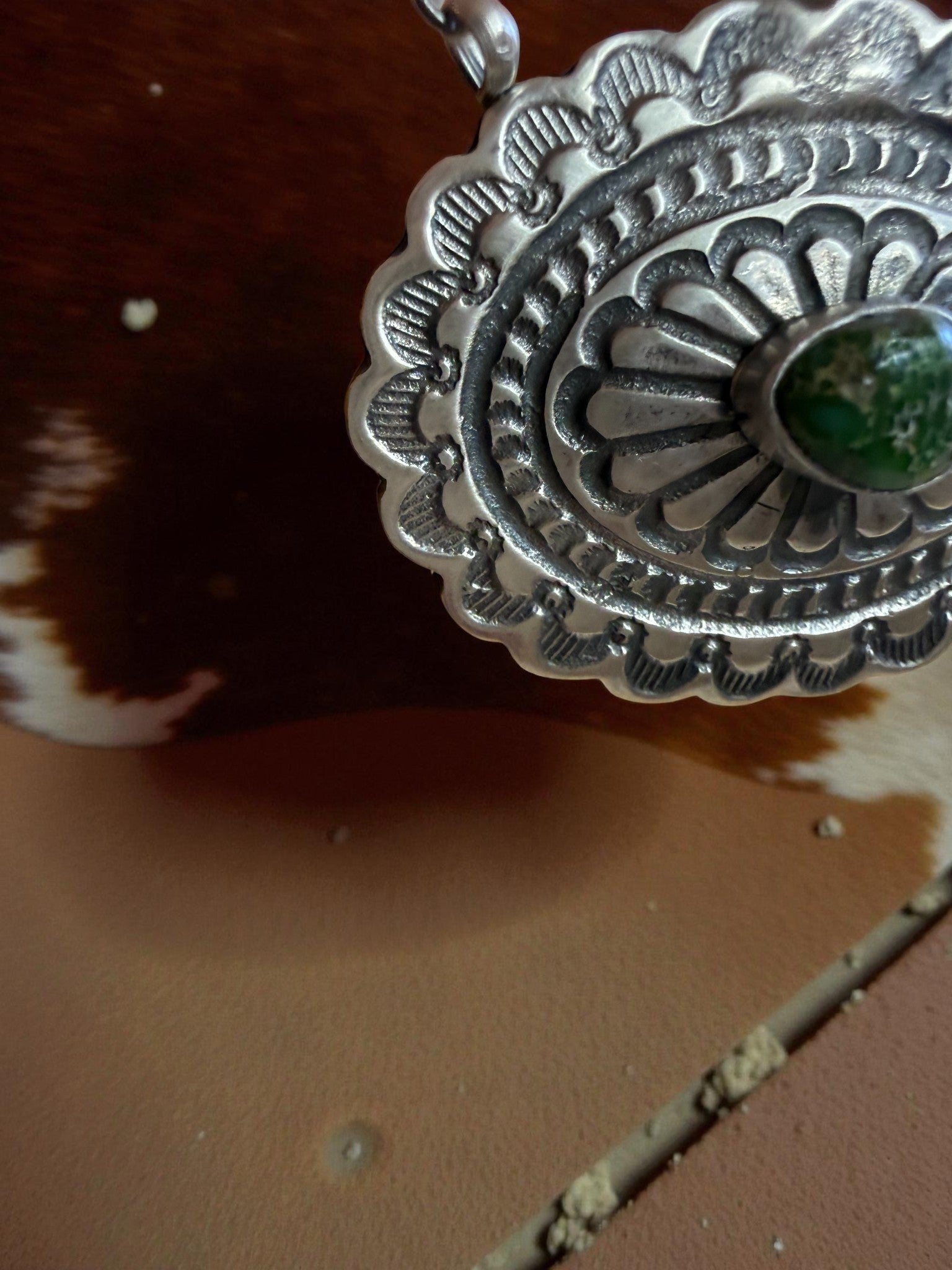 A concho pendant featuring a natural green turquoise stone set at the center of layered stamping and scalloped silverwork. The detailing is crisp, the shape is classic, and the pendant hangs from a sturdy sterling chain that gives the whole piece a grounded, wearable feel.