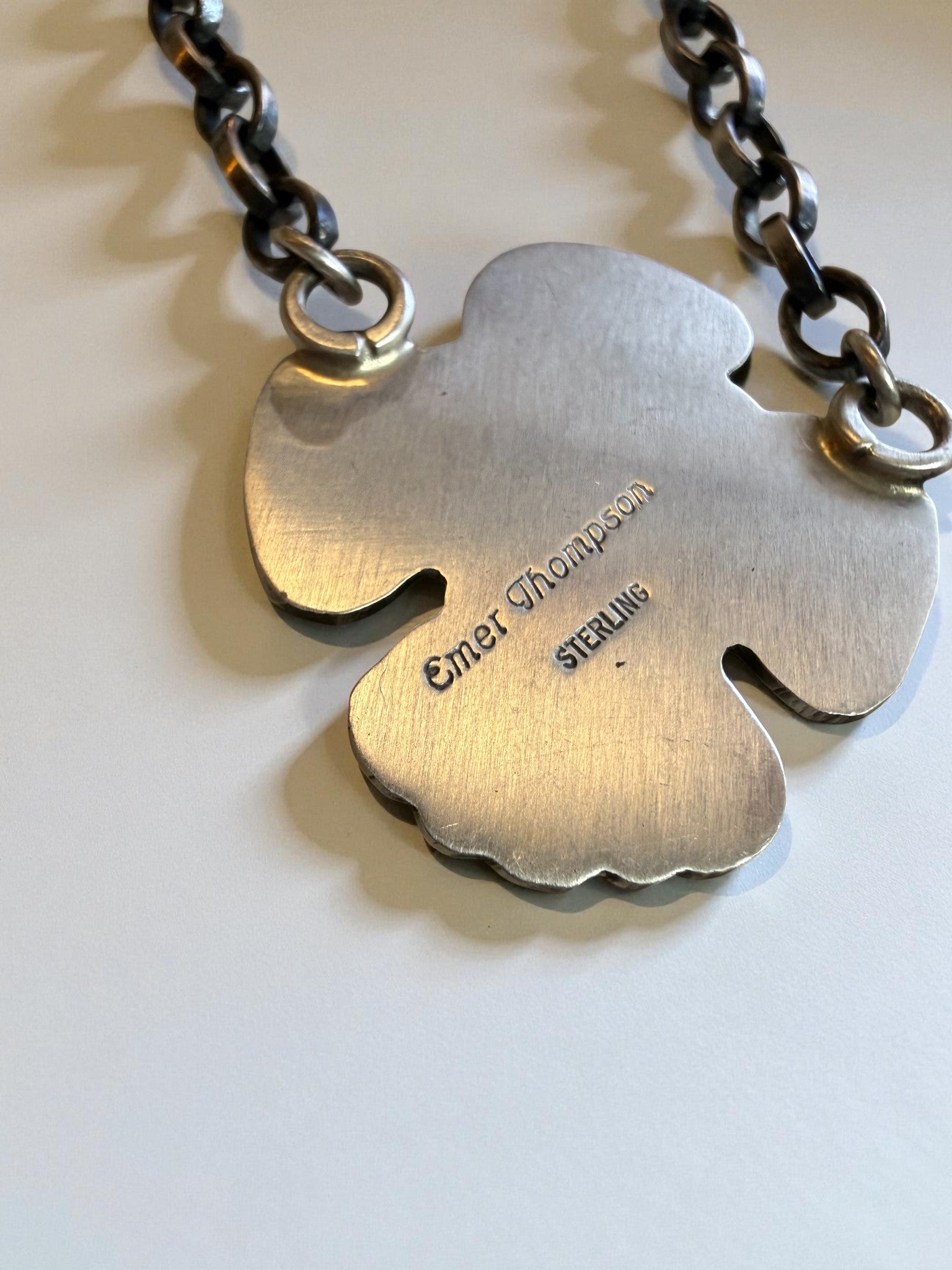 A handmade thunder bird bar necklace by Emer Thompson featuring a cluster of natural turquoise. The silverwork is clean and classic, with smooth bezels, subtle detailing, and a design that sits beautifully on the neckline. Balanced, wearable, and unmistakably handmade.
