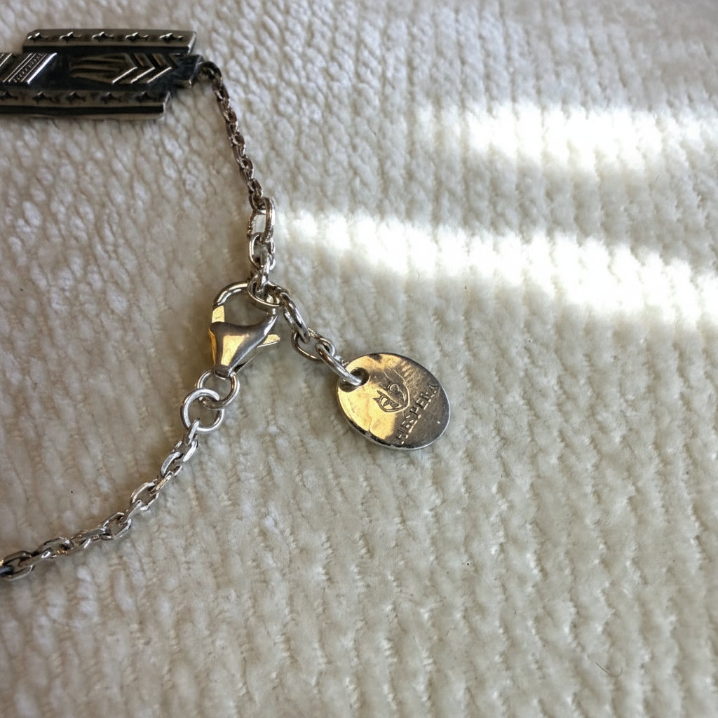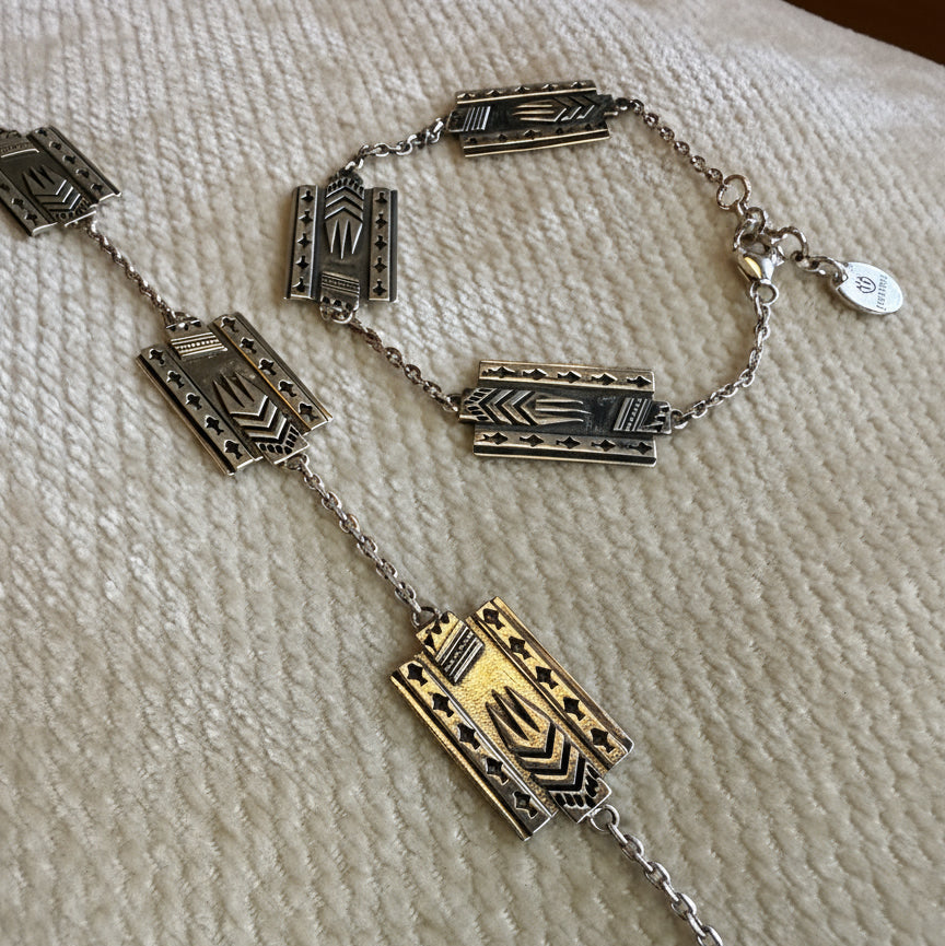 Three stationed charms, perfectly spaced and stamped with that sharp, graphic silverwork Eric is obsessed with. This bracelet hits clean, stacks easy, and look even better (if possible) on. Adjustable from 7 to 8 inches, it’s built for mixing, matching, and telling your story your way.