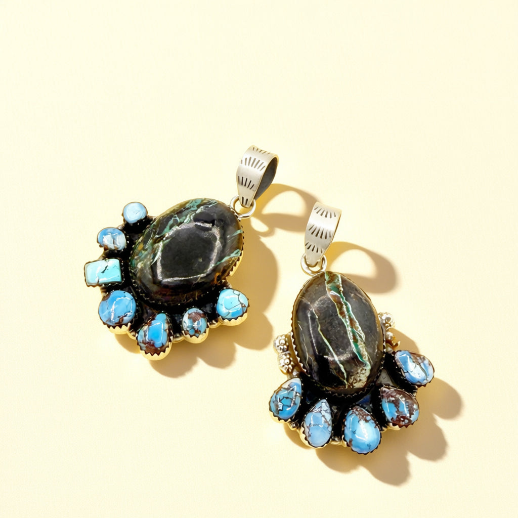 Designed by HJC in sterling silver, this pendant features a Blackjack turquoise framed by Golden Hills turquoise in a clustered composition.