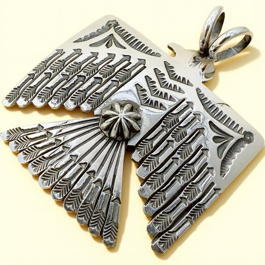 Handcrafted by Sunshine Reeves, this sterling silver Thunderbird concho pendant measures approximately 2.5 inches in length and features an 8mm bale, with stamped details that vary by piece.