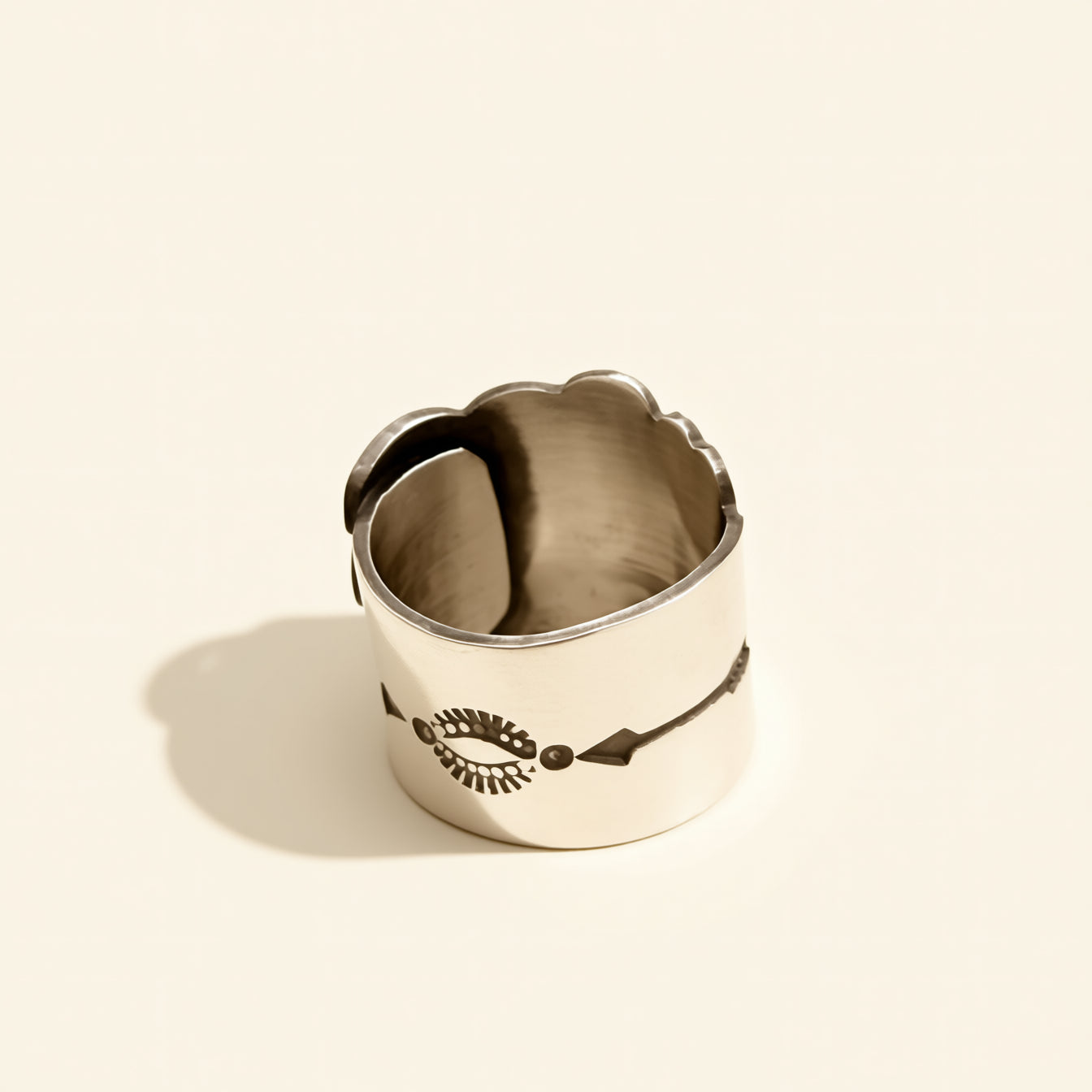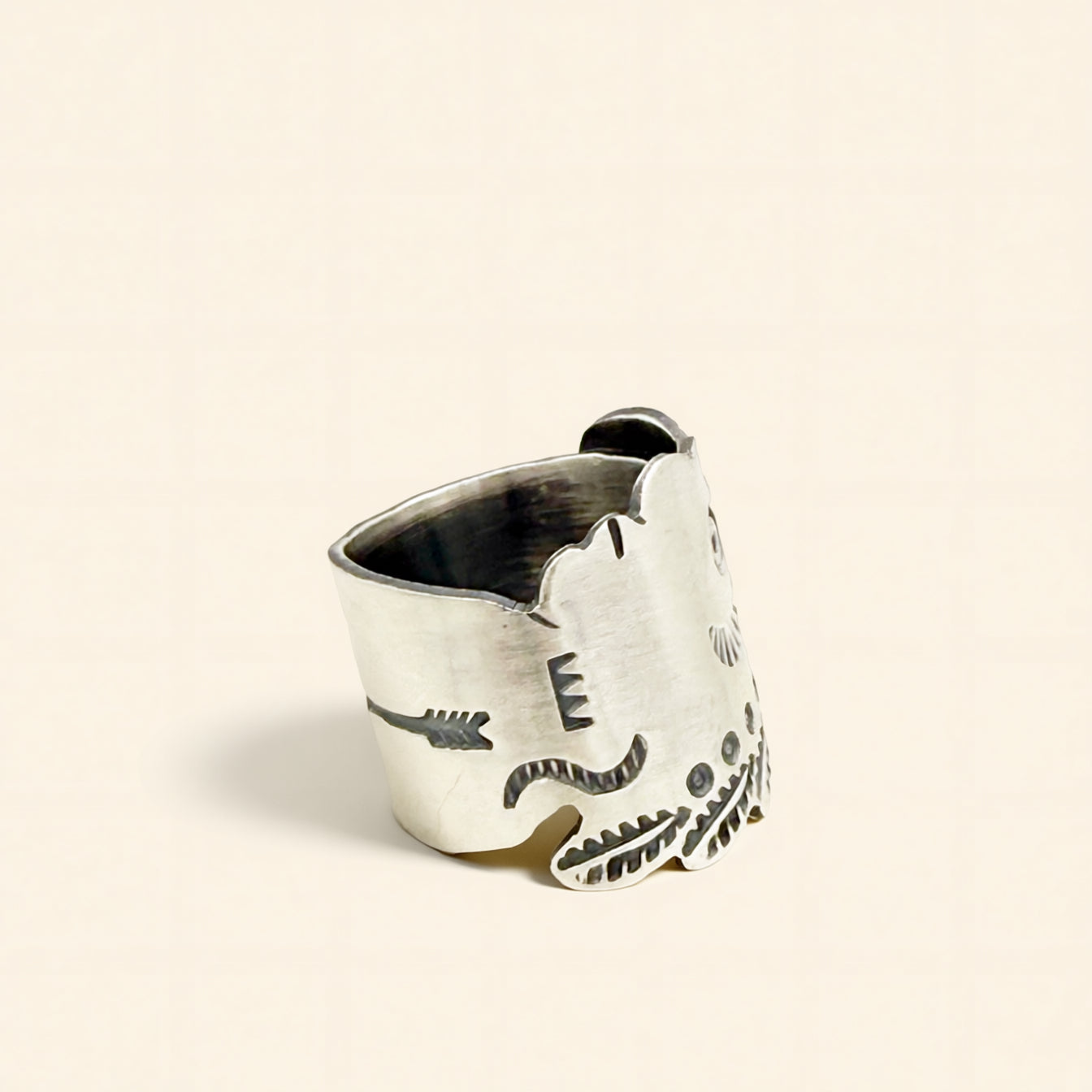 Handcrafted by  Andy Cadman, this sterling silver ring features his iconic Famous Chief design in a bold, sculptural silhouette. It is true to size, and showcases one of his most recognized motifs.