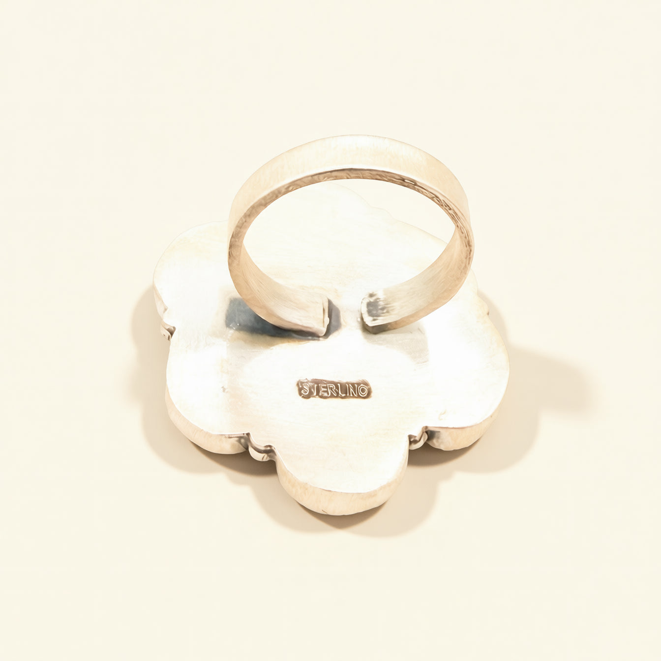 Designed by HJC,  this sterling silver ring features a vibrant cluster of Golden Hills Turquoise in a dimensional, floral-inspired arrangement. It is handmade, measures 1.5 inches across the face, and is adjustable.