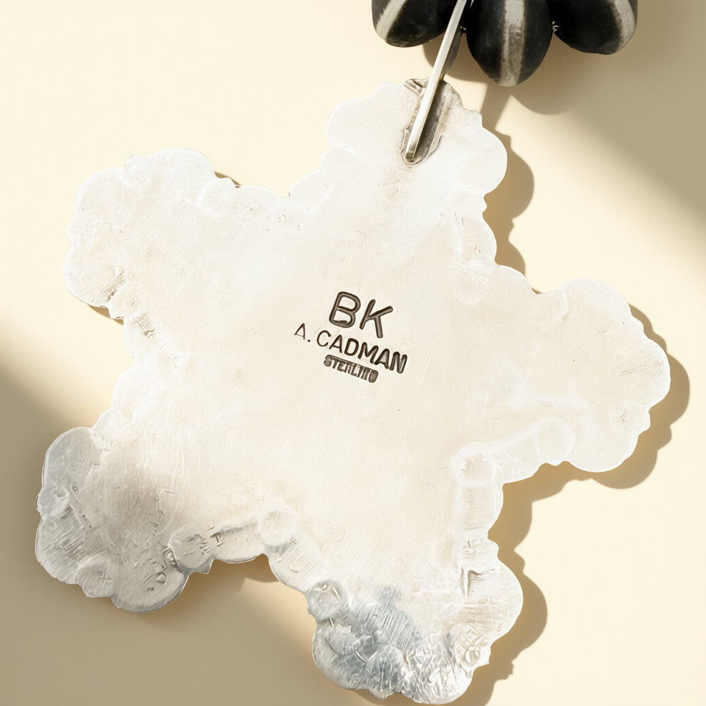 Handcrafted by Andy Cadman, this sterling silver necklace is paired with Navajo pearls by Brennon Kevin Cadman. Measures 24 inches in length.
