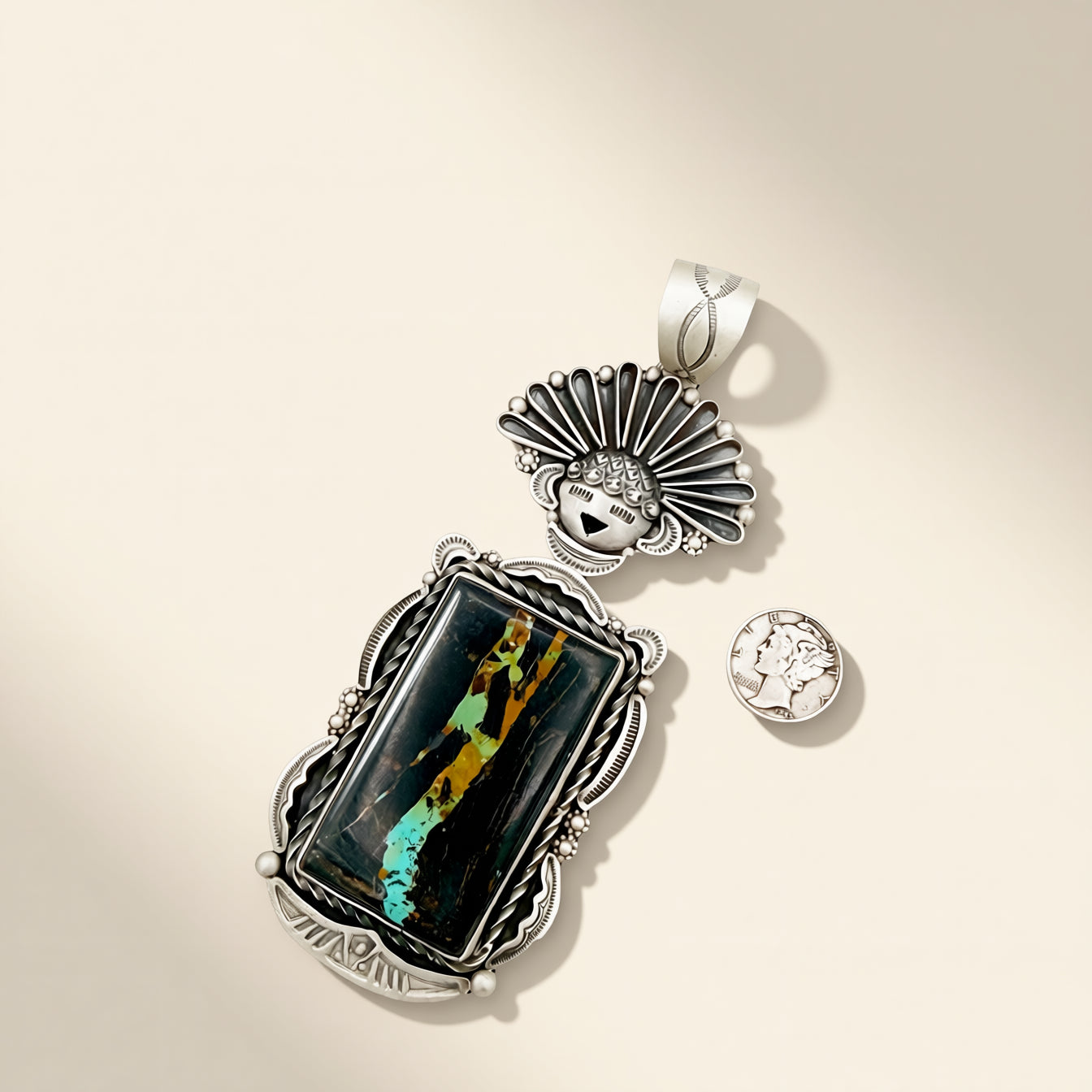 Blackjack Turquoise is known for its dense, high-contrast matrix and darker green tones, material that stands apart the moment you see it. The maiden anchors that intensity with a form that has been carried through generations, giving the piece a sense of continuity that goes beyond a single pendant.