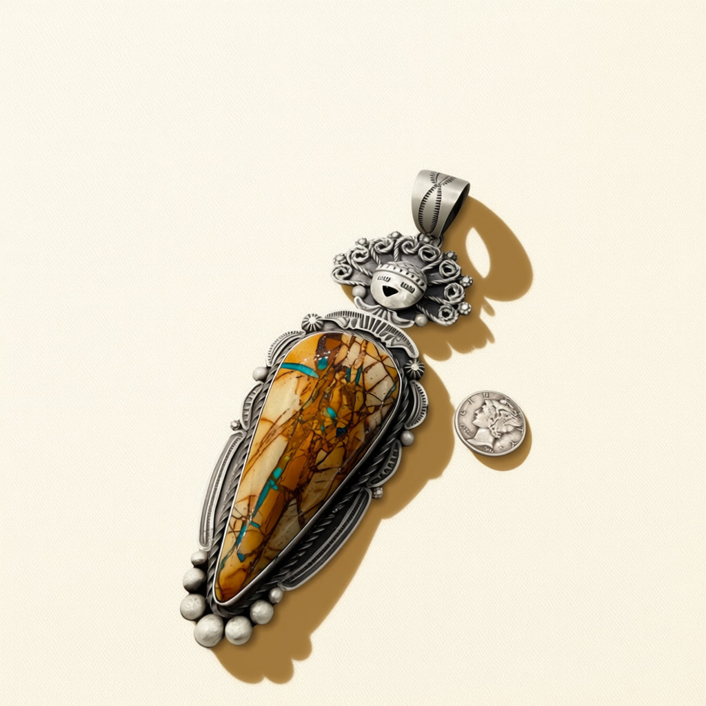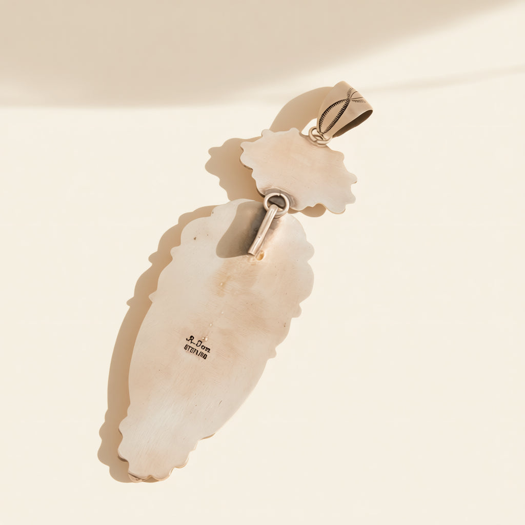 Handcrafted by Ronald Tom, this articulated pendant showcases Royston Ribbon Turquoise set in sterling silver. It measures 5.5 inches in length with sculptural silver detailing throughout.